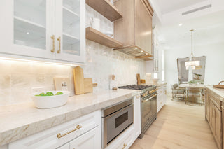 To stage the property for the market, Vesta Creative Director Linda Kennedy brought an organic modern sensibility, pairing the home's crisp architectural lines with soft, natural textures echoing West Palm Beach’s breezy sophistication. In the kitchen, Beverly Blvd counter stools in ivory boucle with a brushed brass-plated stainless steel base provides a classical contrast to the sleek Taj Mahal quartzite island. Outdoors, Vesta Home's Valletta collection—crafted with teak bases and quick-dry cushions—creates a chic setting for coveted, year-round coastal living.