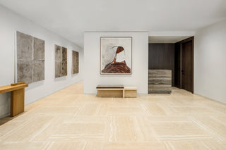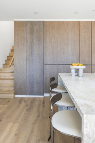 Vesta Home's New York Creative Director Christina Slater staged the penthouse in an organic modern style, drawing from a palette of driftwood neutrals—muted blues, off-whites and warm wood tones. Bouclé textures, brushed metals and natural stone accessories infuse warmth throughout. In the living room, a pair of Coronado Sofa Chairs with their soft edges and tufted detailing balance comfort and elegance. Off the living room, the study features the Antibes Lounge Chair; its unique shape adds visual interest. Together, these selections contribute to the sense of sanctuary, shaping an elevated escape high above the city's energy.